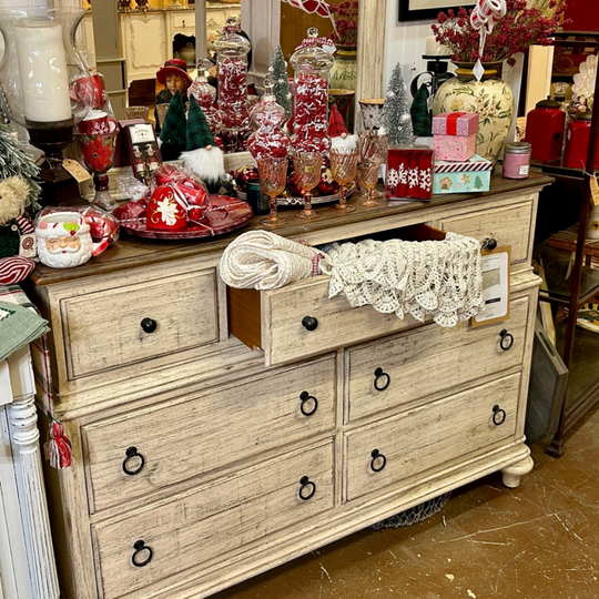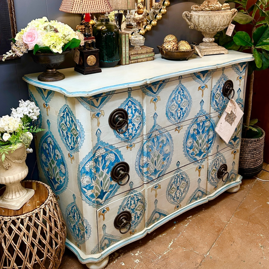 This elegant vintage dresser combines timeless French Provincial design with practical storage. Finished in a soft blue with subtle distressing and a natural wood top, this nine-drawer piece features gracefully curved lines and ornate brass handles. Perfect for adding a touch of sophistication to a bedroom, living room, or entryway, this dresser offers ample space to keep your belongings organized while enhancing your decor. A stunning blend of function and artistry, it’s an ideal choice for lovers of vintage and cottage-inspired aesthetics.