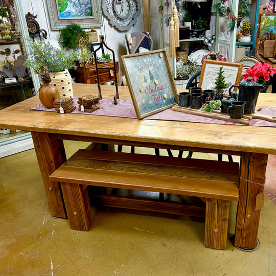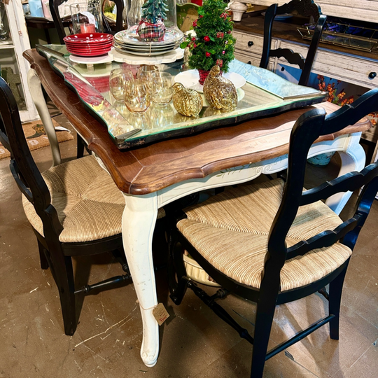 Create a warm and inviting dining experience with this charming vintage farmhouse dining table and chair set. Featuring a sturdy wooden table with a natural finish, this piece is perfect for hosting family gatherings and festive meals. The set includes classic ladder-back chairs with woven rush seats, offering both comfort and rustic appeal. Ideal for a farmhouse or traditional decor style, this dining set is perfect for everyday use or as a centerpiece for special occasions. Add timeless character and functionality to your home with this beautiful vintage set.